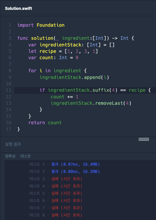여기서 흥미로운 점은 11번째 행에서 ingredientStack.suffix(4)를 Array로 감싸지 않으면 시간초과가 뜬다는 것이다.