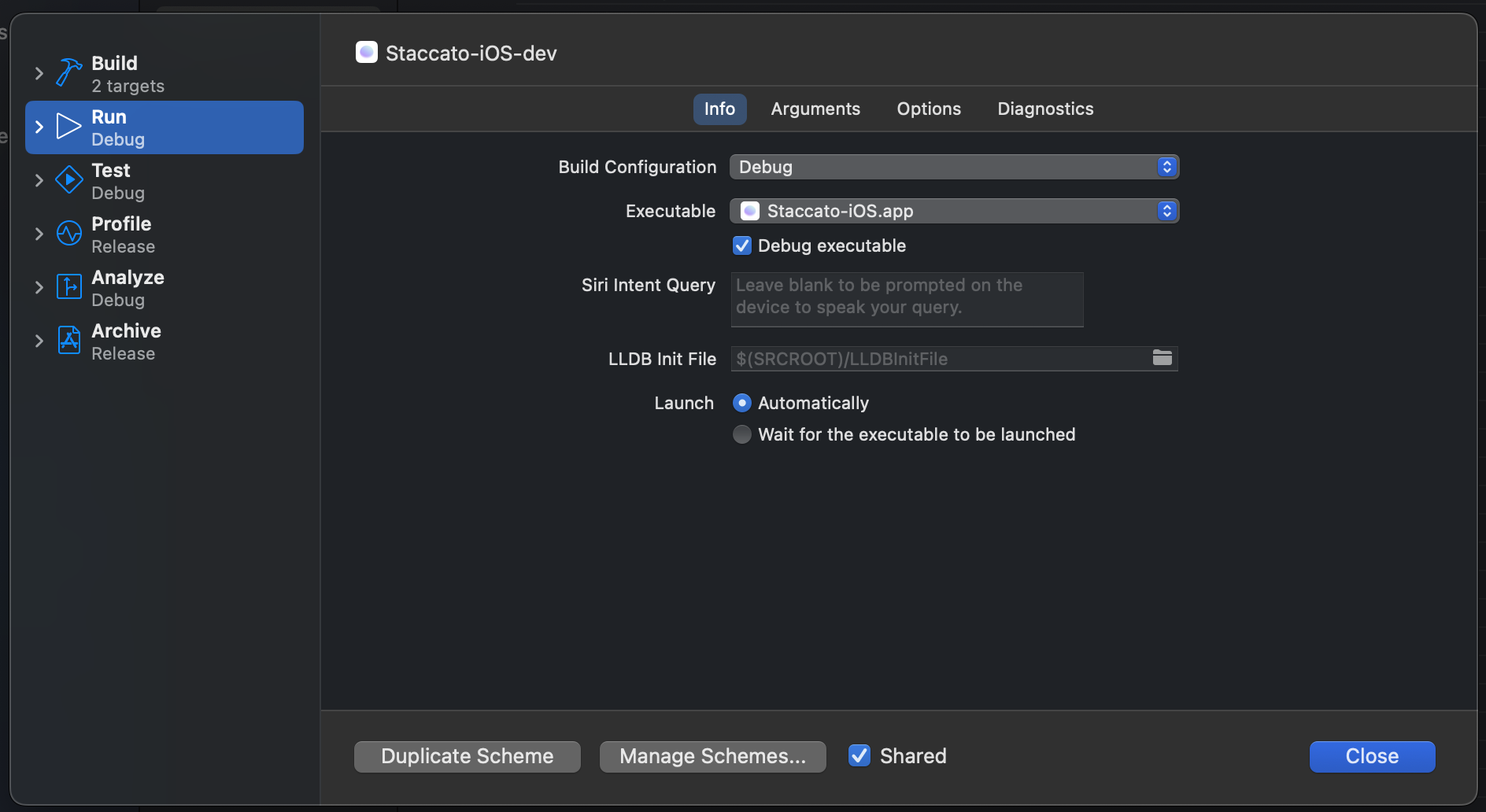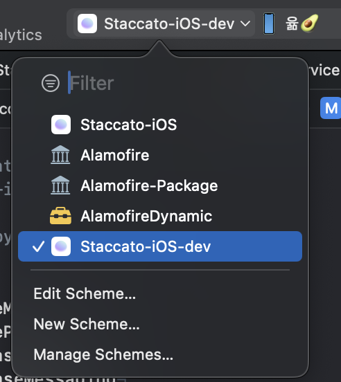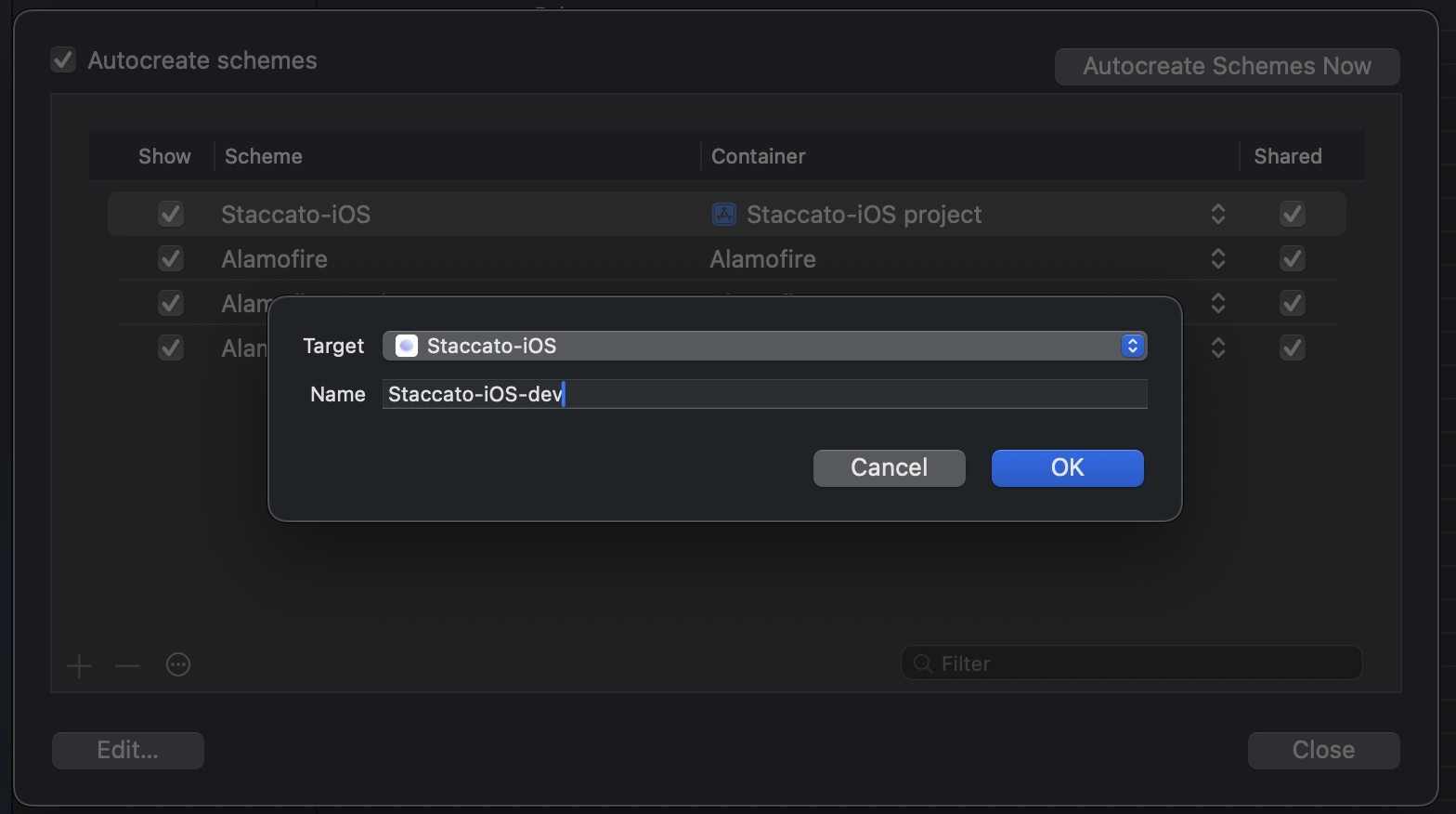 Manage Schemes... -> + 버튼 클릭 -> Staccato-iOS-dev를 추가