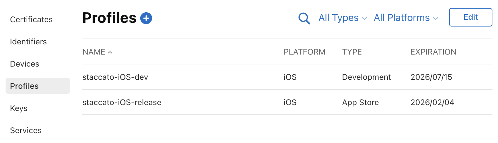 5.2. Profiles 에서 dev 프로파일 클릭 > Edit 클릭 > App ID를 5.1에서 생성한 ID로 변경 > Download