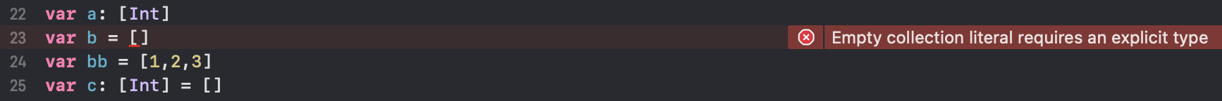 배열 변수를 empty collection '[]'으로 선언할 때는 꼭 데이터 타입을 명시해야 한다.