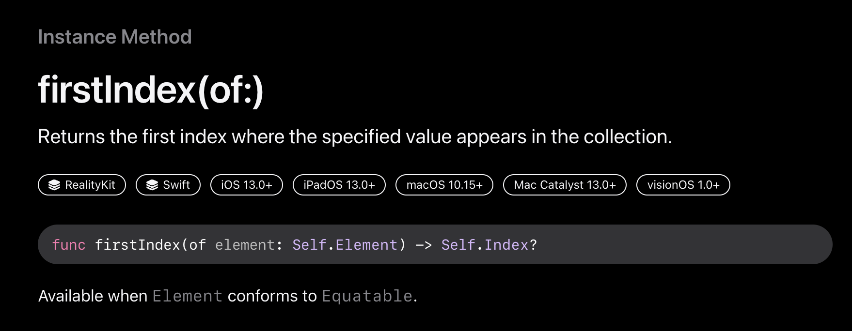 ▶️ index 시리즈 - firstIndex(of:), firstIndex(where:), lastIndex(of:), lastIndex(where:)
