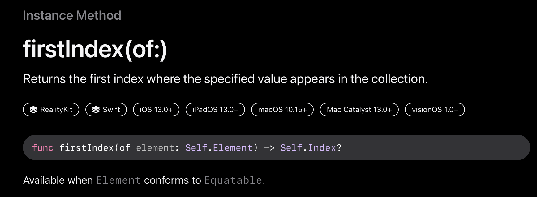 enumerated()와 firstIndex(of:)...은 배열과 같은 콜렉션 타입(링크)에서 인덱스 번호를 찾거나, n번째 인덱스 값을 구하고 싶을 때 사용할 수 있는 메소드이다.