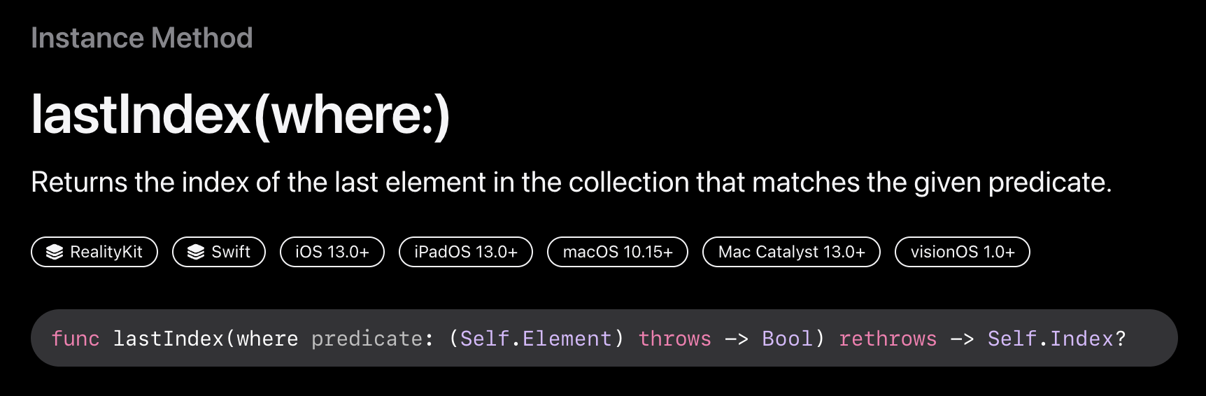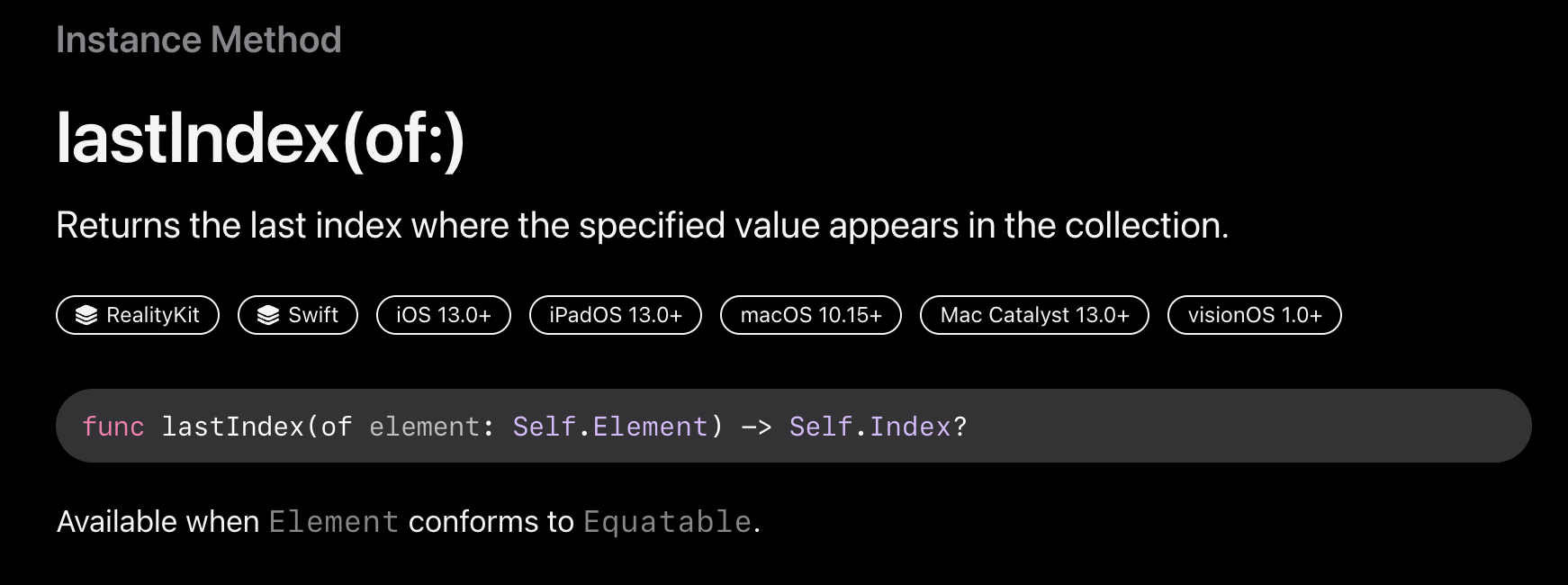print(feelings.lastIndex(of: "sad")) // Optional(3)