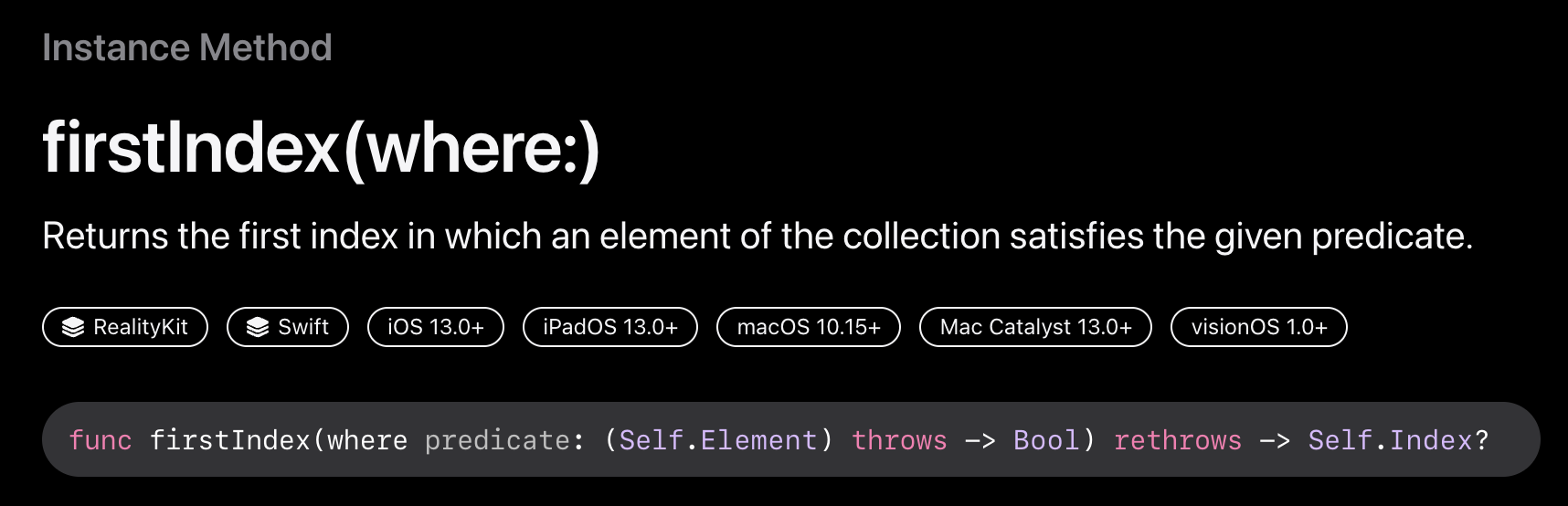- firstIndex(of:), firstIndex(where:)... : 인덱스 번호를 옵셔널 타입으로 반환