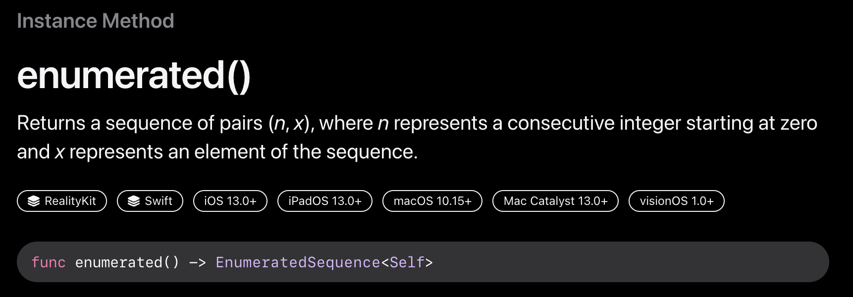 enumerated()는 (인덱스 번호, 인덱스 값) 쌍을 반환하는 인스턴스 메소드이다.