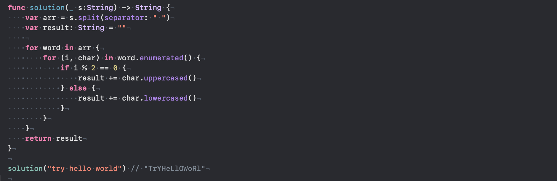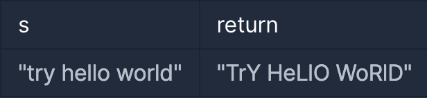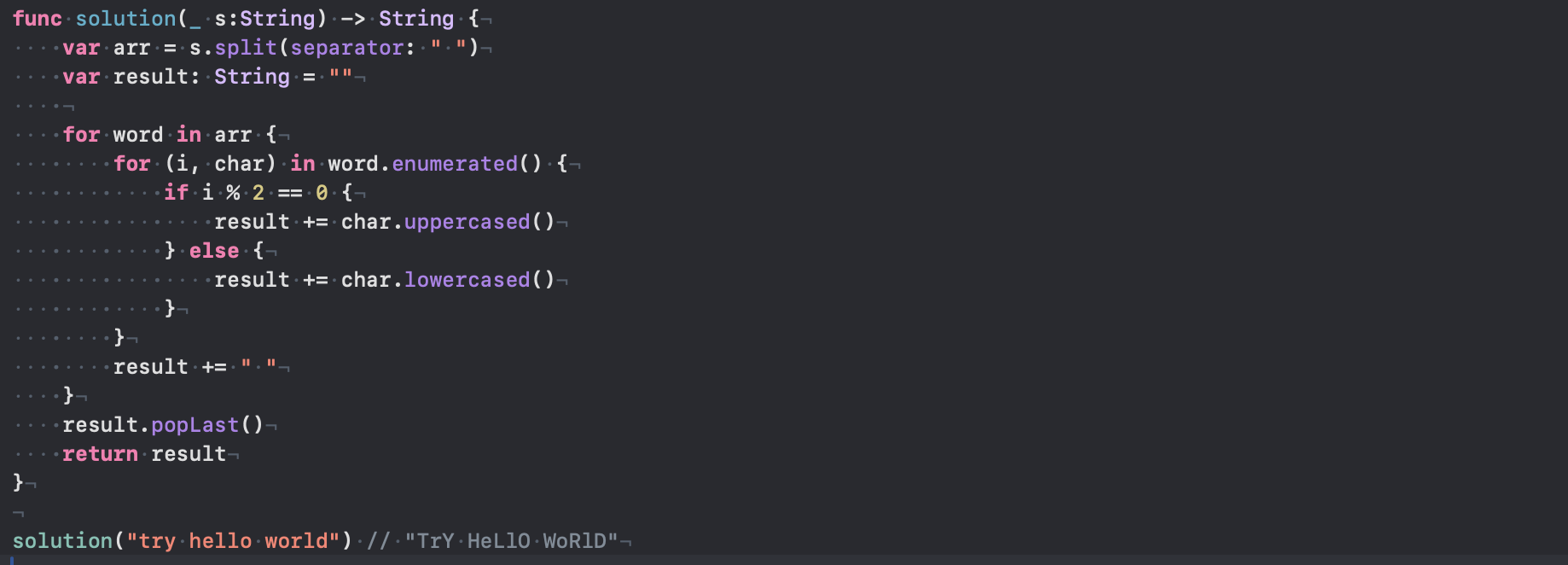문자열 s는 한 개 이상의 단어로 구성되어 있습니다. 각 단어는 하나 이상의 공백문자로 구분되어 있습니다. 각 단어의 짝수번째 알파벳은 대문자로, 홀수번째 알파벳은 소문자로 바꾼 문자열을 리턴하는 함수, solution을 완성하세요.