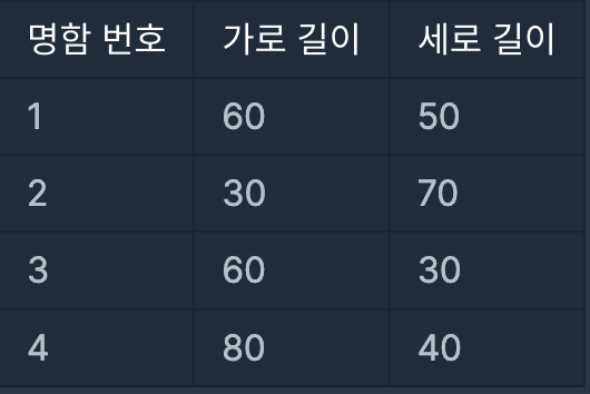 문제 설명 명함 지갑을 만드는 회사에서 지갑의 크기를 정하려고 합니다. 다양한 모양과 크기의 명함들을 모두 수납할 수 있으면서, 작아서 들고 다니기 편한 지갑을 만들어야 합니다. 이러한 요건을 만족하는 지갑을 만들기 위해 디자인팀은 모든 명함의 가로 길이와 세로 길이를 조사했습니다.아래 표는 4가지 명함의 가로 길이와 세로 길이를 나타냅니다.