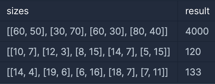 가장 긴 가로 길이와 세로 길이가 각각 80, 70이기 때문에 80(가로) x 70(세로) 크기의 지갑을 만들면 모든 명함들을 수납할 수 있습니다. 하지만 2번 명함을 가로로 눕혀 수납한다면 80(가로) x 50(세로) 크기의 지갑으로 모든 명함들을 수납할 수 있습니다. 이때의 지갑 크기는 4000(=80 x 50)입니다. 모든 명함의 가로 길이와 세로 길이를 나타내는 2차원 배열 sizes가 매개변수로 주어집니다. 모든 명함을 수납할 수 있는 가장 작은 지갑을 만들 때, 지갑의 크기를 return 하도록 solution 함수를 완성해주세요.