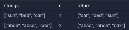 - 모든 strings의 원소의 길이는 n보다 큽니다.