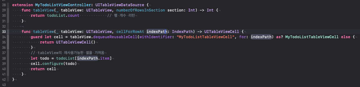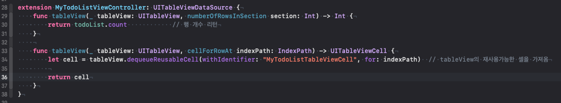 맨 아래쪽에 extension 으로 UITableViewDataSource 를 상속하여 필수구현 함수를 구현한다.