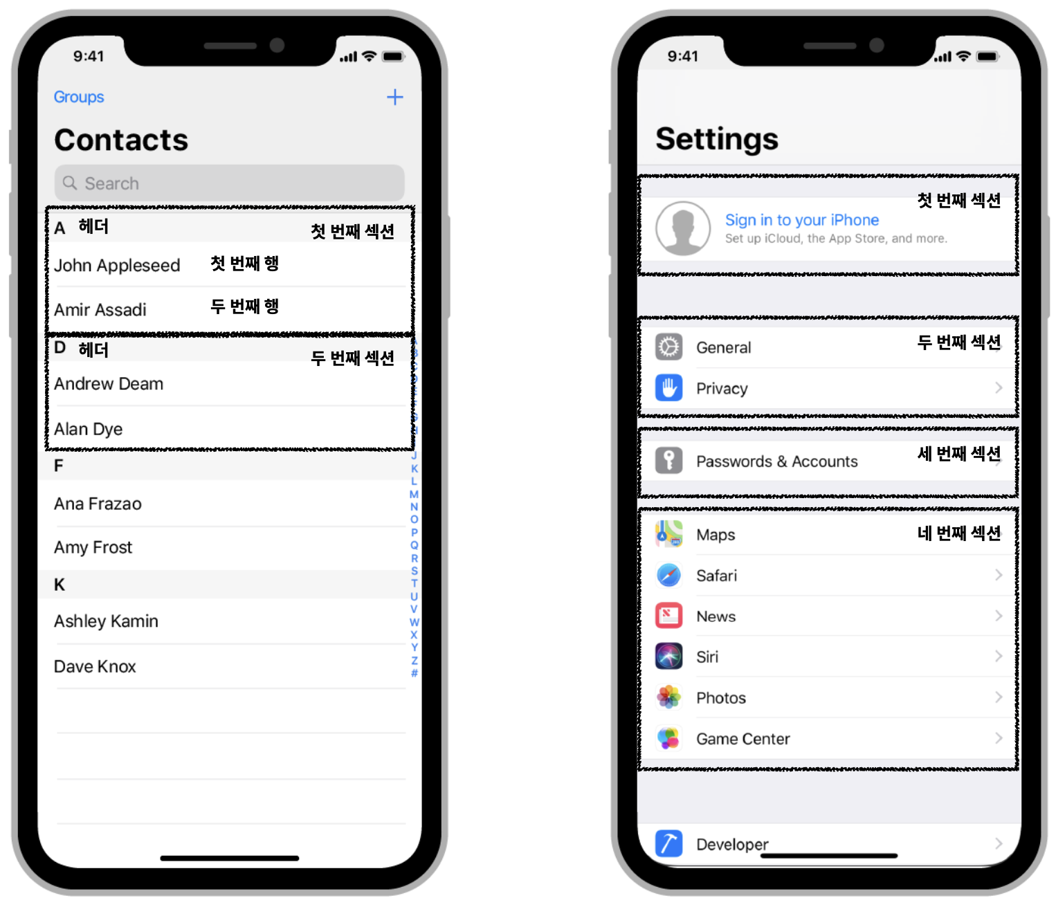 - 섹션의 헤더와 푸터에 View를 구성하여 추가적인 정보를 표시할 수 있다.