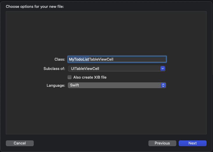 custom cell을 표현하는 코드를 만들기 위해, 먼저 TableViewCell 파일을 새로 만든다.