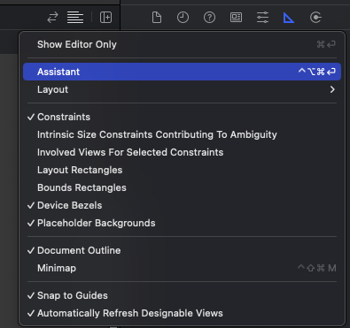 1. Main Storyborad에서 오른쪽 상단에 줄글처럼 생긴 [Adjust Editor Options] 클릭 > Assistant 클릭하여