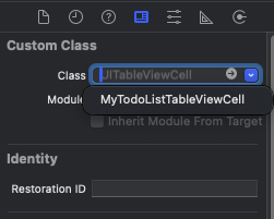 1. Main 스토리보드 > TableViewCell의 Identity 인스펙터 > Custom Class > Class에 붙여넣는다.