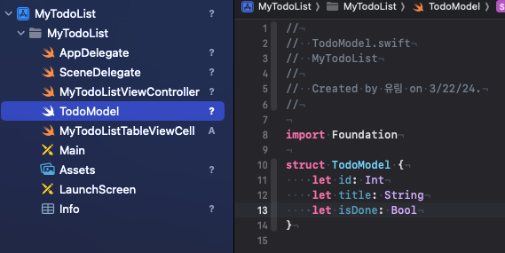 TodoModel이라는 Swift 파일을 새로 생성하여 데이터 구조를 만든다.