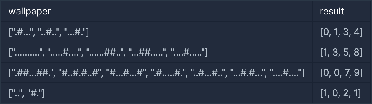예를 들어 wallpaper = [".#...", "..#..", "...#."]인 바탕화면을 그림으로 나타내면 다음과 같습니다.